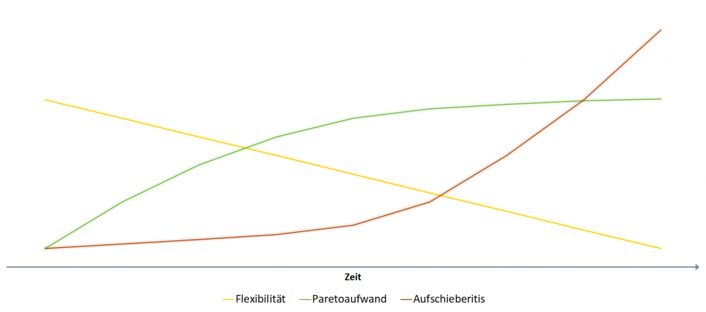 Je früher die 1. Etappe abgeschlossen ist, desto besser ist dabei das Verhältnis von Zielerreichung zu Arbeitsaufwand. Wer gerne „aufschiebt“ kennt das Problem, das zum Ende hin plötzlich alles zu viel wird. Das werden wir vermeiden! In der nachfolgenden Grafik ist das Zusammenspiel von Zeitablauf und dem Arbeitsaufwand skizziert: Im Zeitablauf sinkt die Flexibilität und unter Zeitdruck, „Auf der Zielgeraden“ nimmt der Aufwand unverhältnismäßig zu.